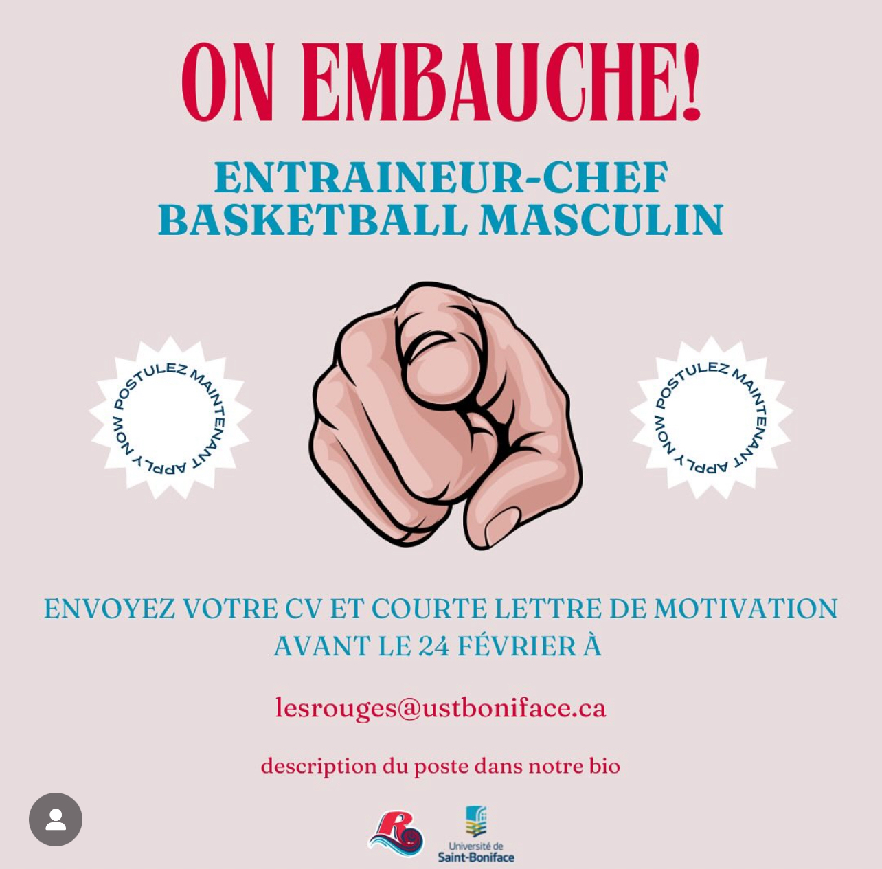 L’Université de Saint-Boniface a annoncé qu’elle accepte les candidatures pour le poste d’entraîneur-chef de l’équipe de basketball masculin. Ce poste offre à un entraîneur expérimenté l’opportunité de diriger un programme en pleine expansion, tout en favorisant le développement des athlètes et la réussite compétitive au niveau universitaire.